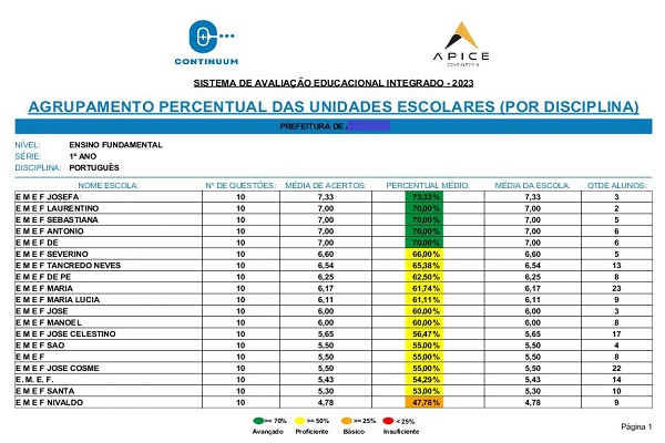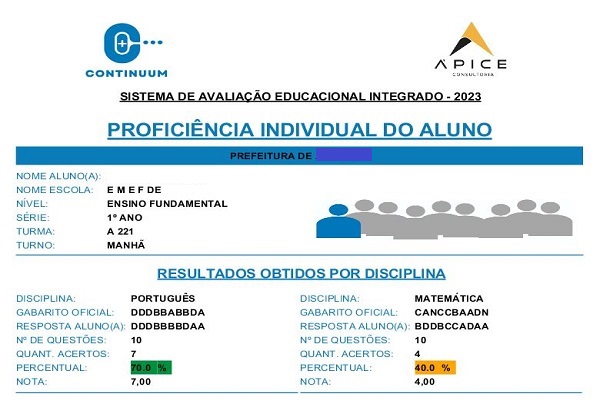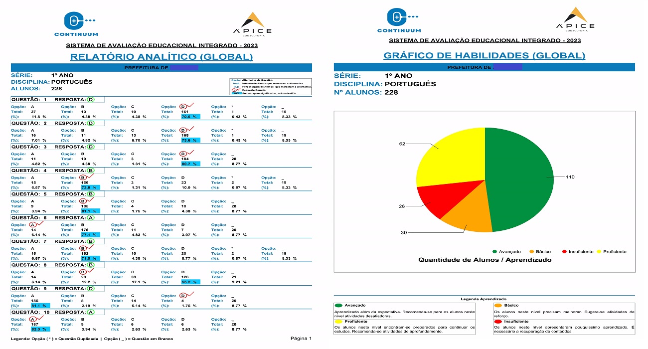 Alguns exemplos dos resultados que serão obtidos pelo Continuum, reunindo informações valiosas que refletem o desempenho dos estudantes, turmas, escolas e do município. Acreditamos que, com o auxílio desses dados, fornecemos informações completas e acessíveis, fundamentais para aprimorar a qualidade do ensino.